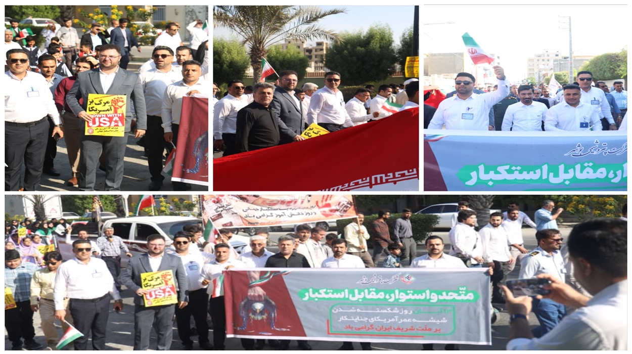 کارکنان پتروشیمی بوشهر در روز ملی مبارزه با استکبار جهانی، همصدا با ملت ایران، با گامهایی استوار و دلهایی سرشار از ایمان، در مسیر عزت و استقلال گام نهادند.